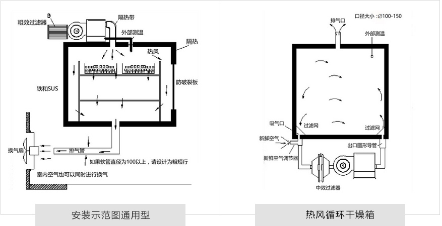 ① 做隔热施工时,建议在出口、吸口的薄管设计的粗短一点。 ② 在放有水分物品干燥时,请设置排气口,请吸入新鲜空气(10-15%)。 ③ 有机溶剂时,无法使用热风循环方式,因为循环型出口温度很高。 |